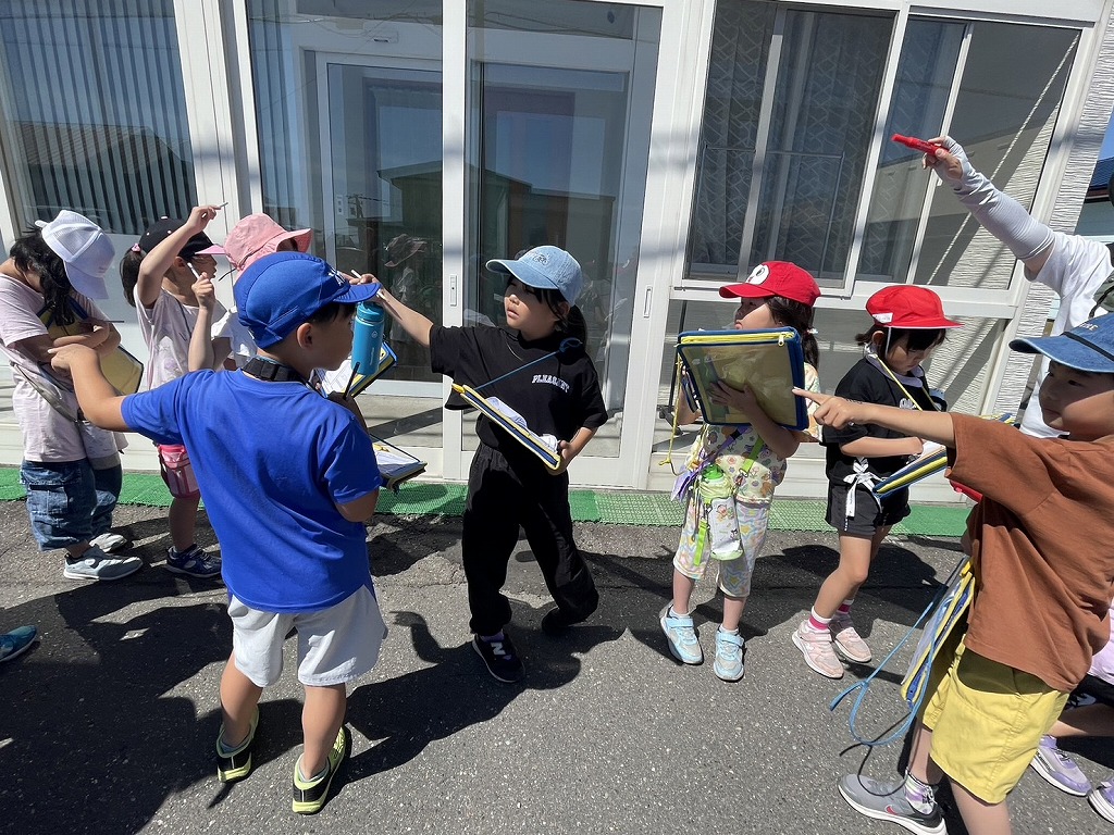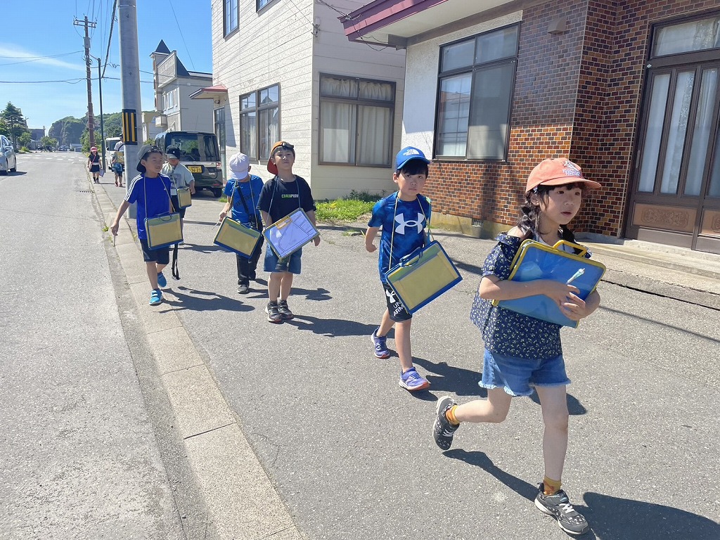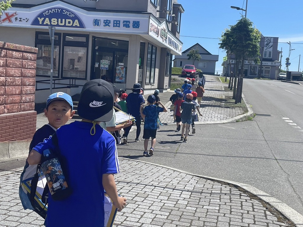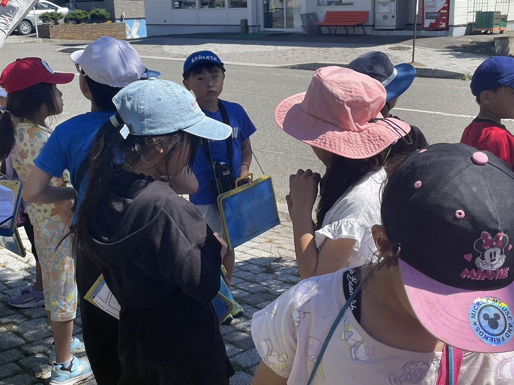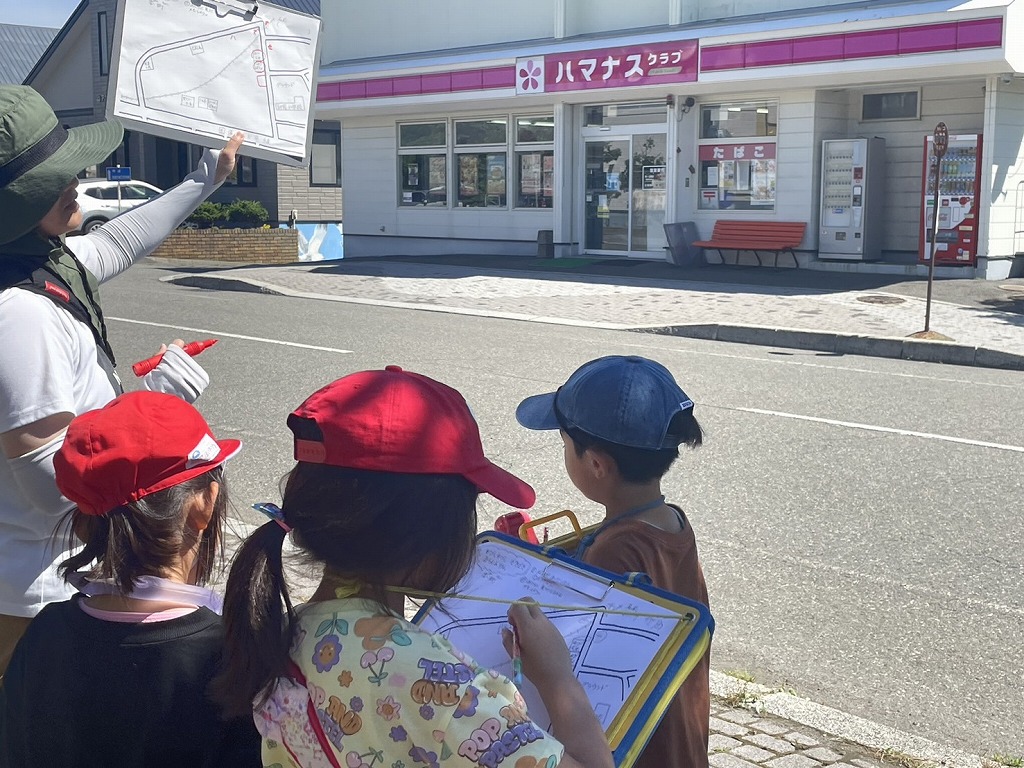 途中、「ハマナスがあった!」「ここが多目的交流センターだ!」「とましんだって…初めて見た!」…と、様々な施設やお店を発見しながら、手に持っている地図で確かめたり、記入したりしていました。普段は車で通ることが多い道、改めて歩いてゆっくり探険してみると、たくさんの発見があったようです。発見したことを記入した地図を嬉しそうに見せてくれた2年生でした。