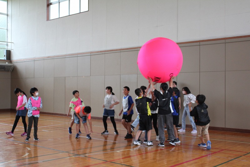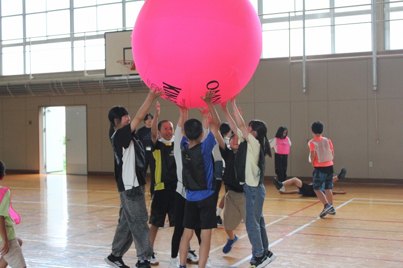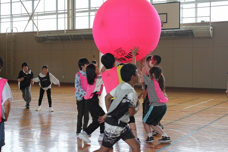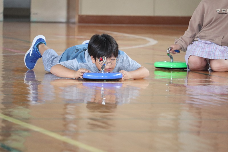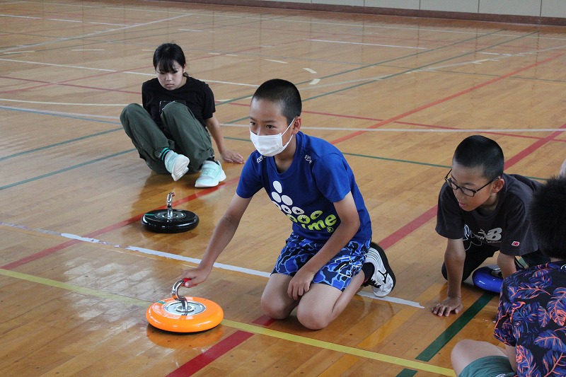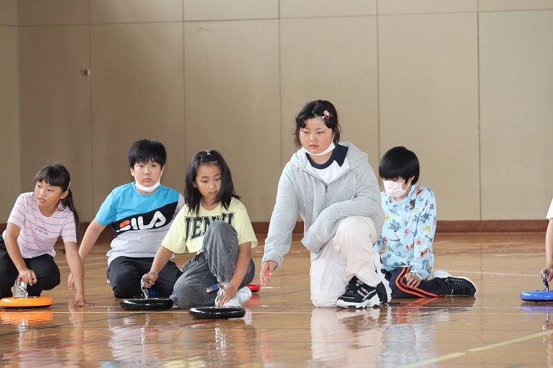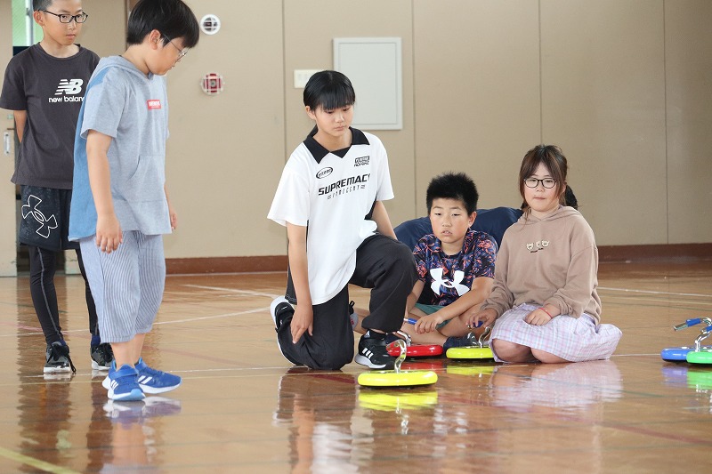 こちらは、「カローリング」です。二日目も町民センターの職員の方々にお世話になり、「カローリング」のやり方やルールなどを教わりながら取り組みました。「カローリング」は、氷上のスポーツ「カーリング」からヒントを得て誕生したインドアスポーツです。カーリングで用いる重いストーンの代わりとなるのが「ジェットローラー」です。裏に車がついていて、力加減によって距離とスピードが大きく変わります。5年生のみんな、この「カローリング」に夢中になり、真剣に取り組んでいました。最後の1投で大逆転もあり、とてもスリリングなだけに1投1投に力が込められました。同じチームの仲間同士で声をかけ合ったり、練習をしたりする姿がとても良かったです。