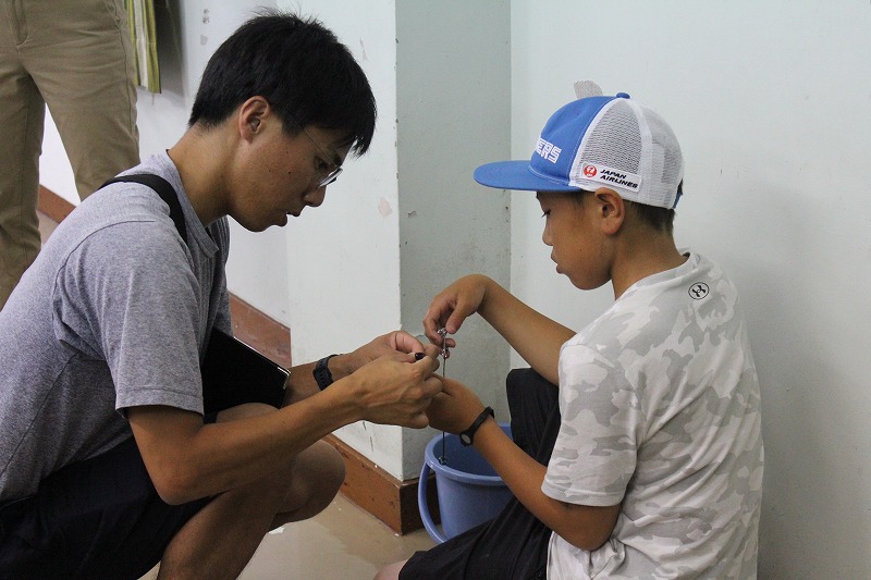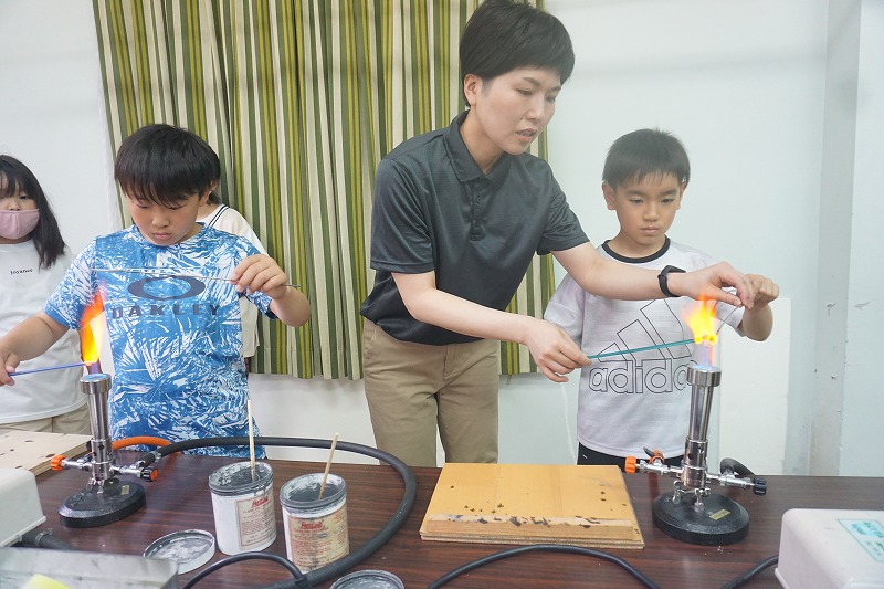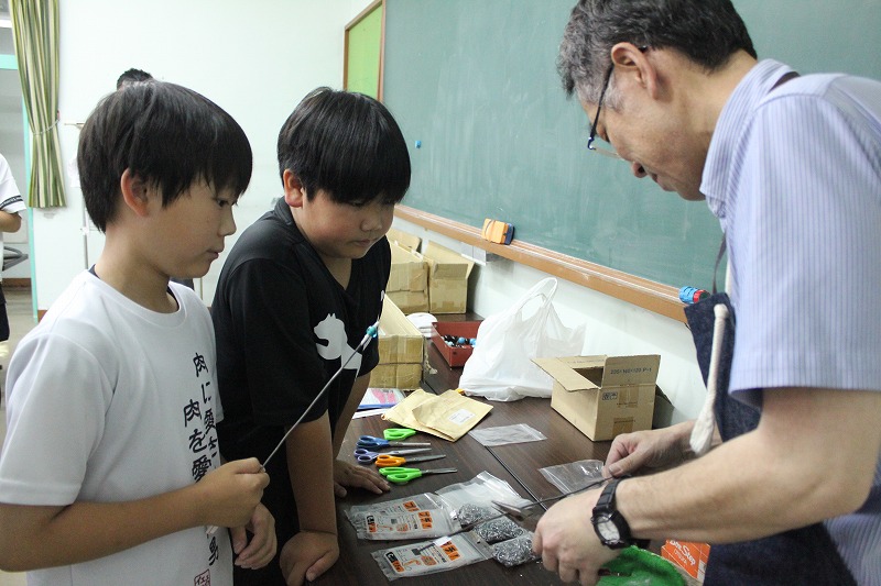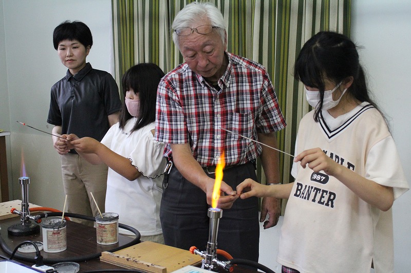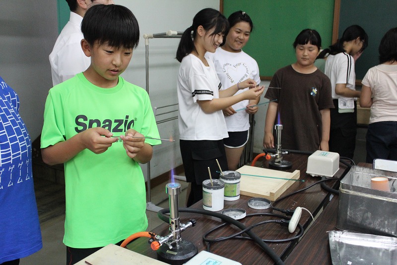 変わってこちらは「とんぼ玉作り」です。大きな炎の出るバーナーを使うので、慎重に安全面に気をつけながら取り組んでいました。お気に入りの色のガラス棒を二本ずつ選び、離型剤という薬品を塗った芯棒を火で熱した後、同じくガスバーナーで溶かしたガラスを巻き取り、芯棒をくるくる回しながら形を整えます。火で熱したガラスは真っ赤になるので色がわかりませんが、冷めるとお気に入りの色がきれいに出てきて、芯棒から抜くとひもを通す穴の開いたガラス玉が完成しました。完成したとんぼ玉はキーホルダーにして、みんな大事そうに持ち帰りました。講師として作り方を教えて下さり、安全面に配慮しながらサポートしてくださった郷土資料館やレコード館の職員の方々のおかげで、大切な宿泊学習の思い出を形として家に持ち帰ることができました。