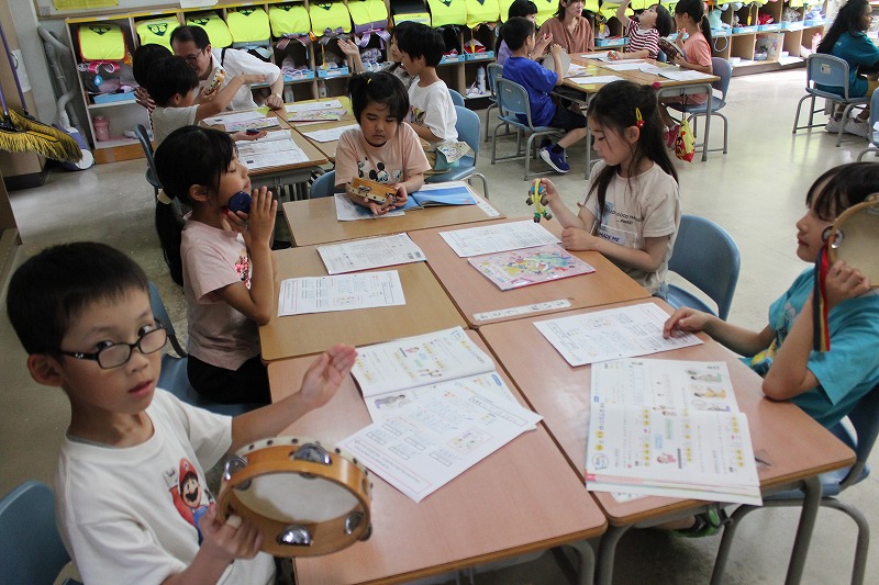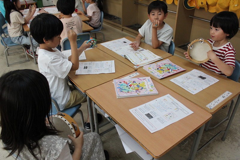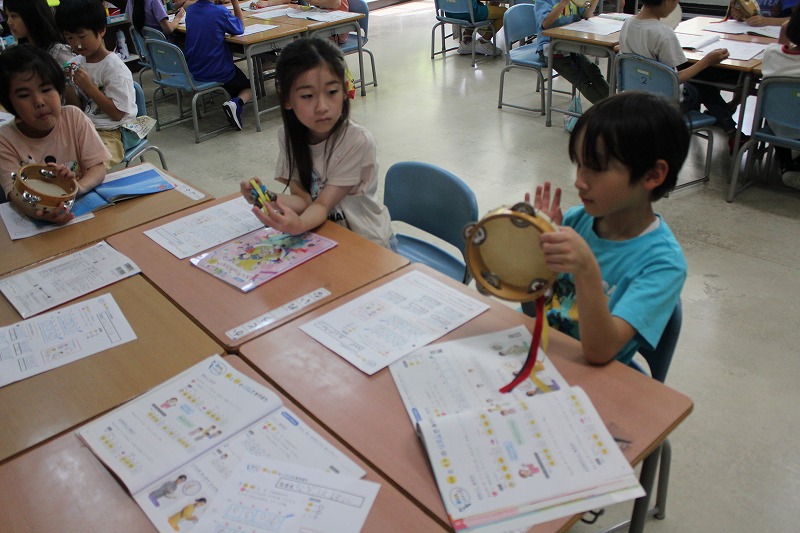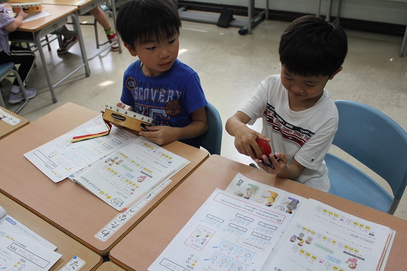 1年生音楽は「リズムであそぼう」の学習。「たん」と「たた」のリズムを組み合わせて、拍に合わせていろいろなリズムで表現することに慣れ親しむ学習活動です。ワークシートを用いて各自で「たん」と「たた」と「うん(お休み)」のリズムを好きに組み合わせて、一人ずつスズやタンバリン、カスタネットなどで表現していました。自分で考えたリズムなのもあって、みんな自信をもって楽しそうに楽器を鳴らしていました。