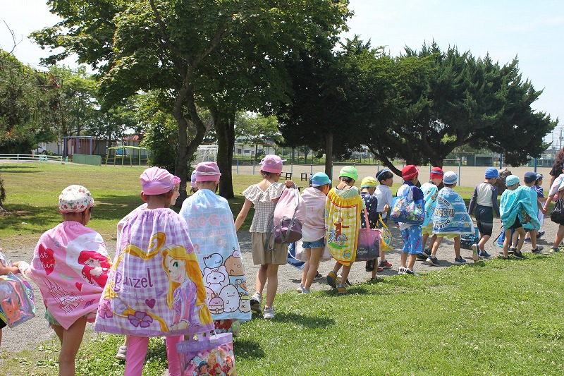 写真は、1年生の様子です。玄関ではバッチリ水着に着替え、町民プールに出かけるのを今か今かと待ち構えてわくわくしていまいた。