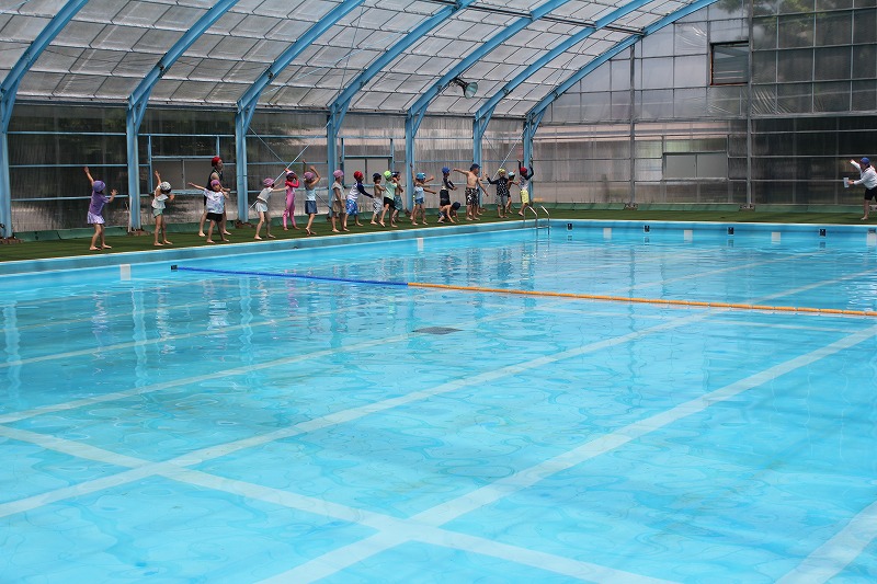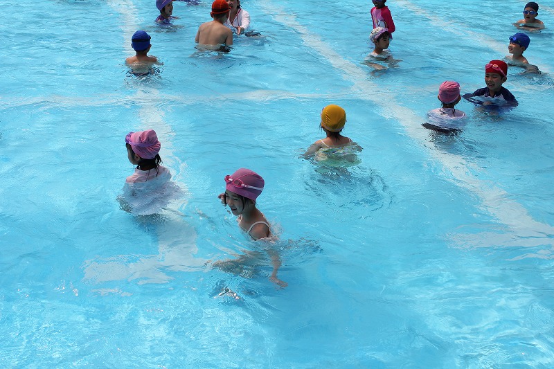 体育では、7月に入ってから全学年が水泳学習に取り組んでいます。教育委員会の方や、管理人の方のご協力のもと、安全面に十分に配慮しながら、進めています。