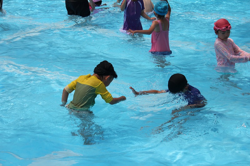 プールでは先生の話をよく聞きながら、準備体操をし、シャワーを浴び、体にたっぷり水をかけてからいよいよ入水!この日の目標は、「顔をつけられるようになろう!」ということで、みんなでじゃんけん列車をしたり、ペアで水をかけ合ったり、水中じゃんけんをしたりしながら、水に慣れ親しんでいました。