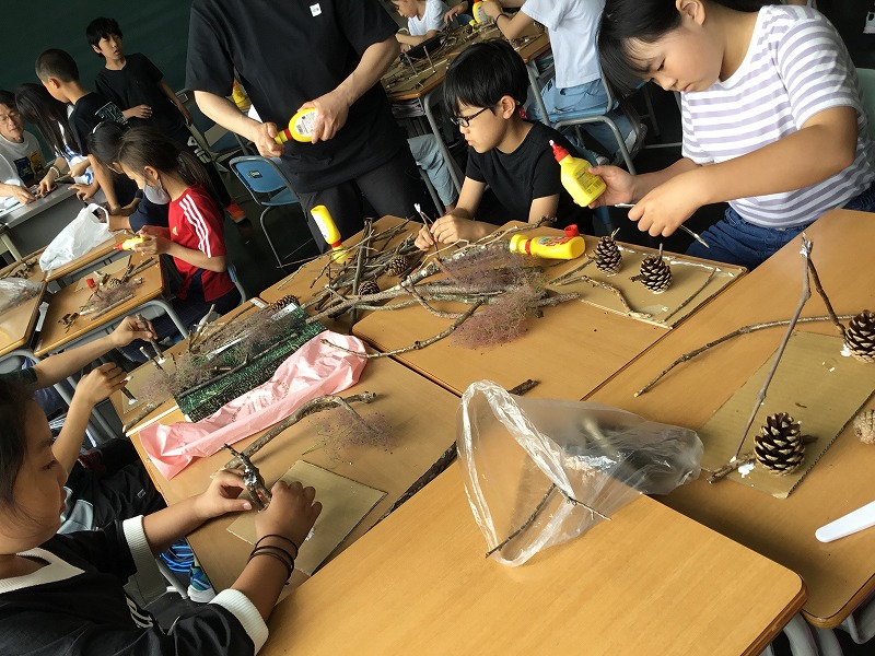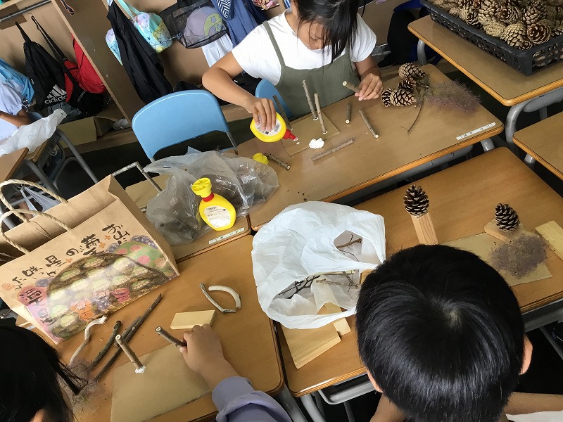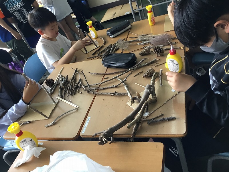 まつぼっくりや、木の枝など、各ご家庭での材料準備のご協力ありがとうございました。子どもたちはそれぞれに持ち寄った材料をじっくり眺めたり、組み合わせたりしながら、表し方を工夫していました。