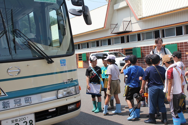 一日目最初の体験活動は、1組がホロシリ乗馬クラブでの乗馬体験、2組が青年の家でのキンボールです。張り切って、でも落ち着いた様子でバスに乗り込んだ5年生39名でした。