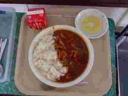 今日の給食献立は、ハヤシライス、パイン、牛乳です。