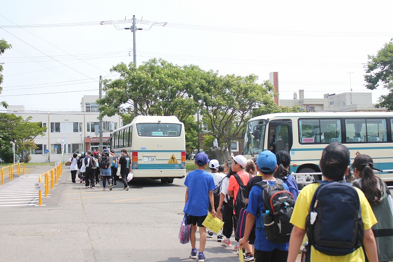 一日目最初の体験活動は、1組がホロシリ乗馬クラブでの乗馬体験、2組が青年の家でのキンボールです。張り切って、でも落ち着いた様子でバスに乗り込んだ5年生39名でした。
