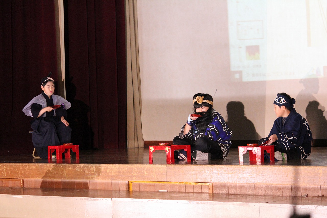 4年生は、社会科や総合的な学習の時間に学んだり、調べたりしてきたアイヌの人たちの歴史について、劇で表現しています。様々な施設の方々のご協力のおかげで、本物のアイヌ文様があしらわれた衣服や剣道着などを衣装としてお借りすることができたことで、劇に臨場感が出ています。一人一人が役になりきり、精いっぱい表現しようという気持ちが伝わってきます。どうぞ金曜日の本番では、4年生みんなで創り上げる『シャクシャインの戦い』から、これまで北海道が歩んできた歴史を感じてください。