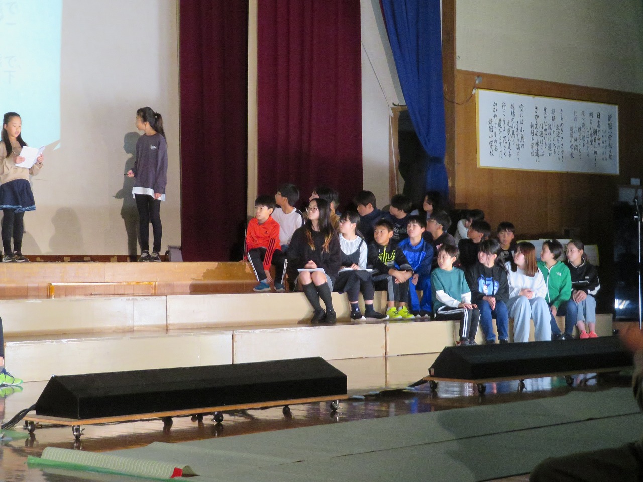 一年生から六年生まで集合し、本番と同じように椅子に座っている姿を見ると、学習発表会当日に向けての緊張感が高まってくるようでした。