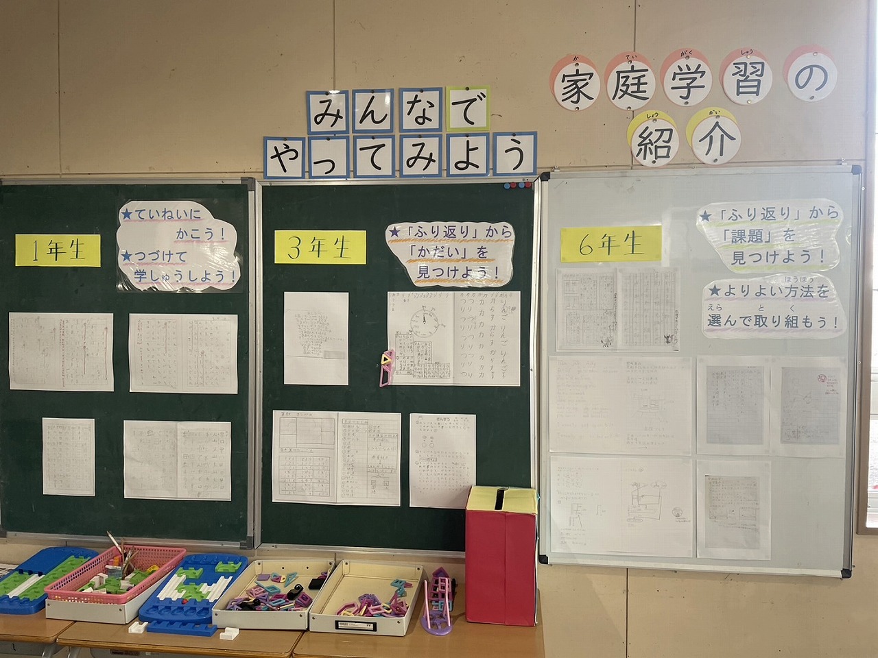 1階と2階の児童玄関前に「家庭学習の紹介」コーナーがあります。各学年の家庭学習を紹介し、友達の取組を参考にできるようにしています。同じ学年の友達だけでなく、他の学年のみんなのノートも見ることができるので、「すごい!」「がんばってるね!」という声の他に、「こうやればいいんだ!」「自分もまねしてみよーっと!」という意欲にもつながります。