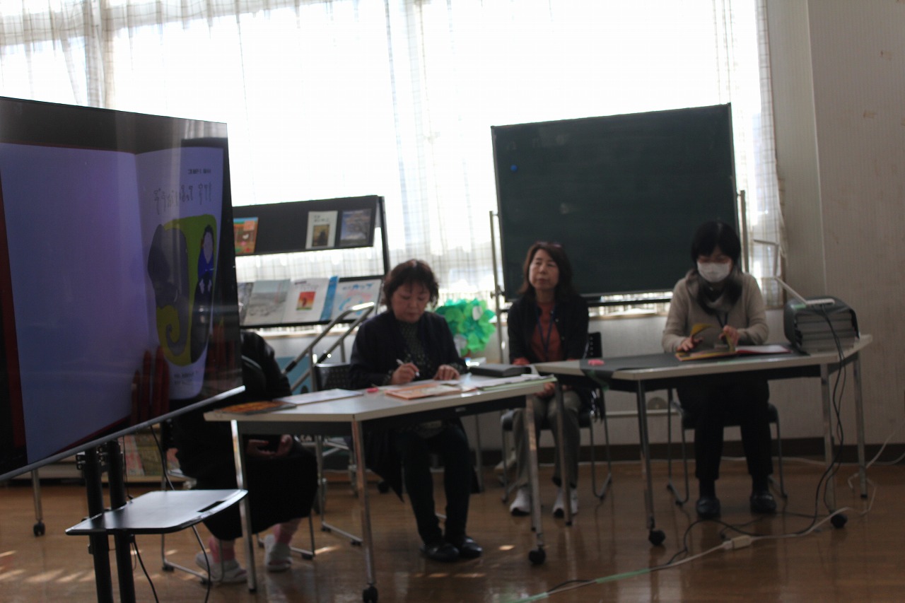 昨日の2時間目は、4年生が読み聞かせを楽しんでいました。図書室内に集まった子どもたちは、すっかり絵本の世界に引き込まれていました。