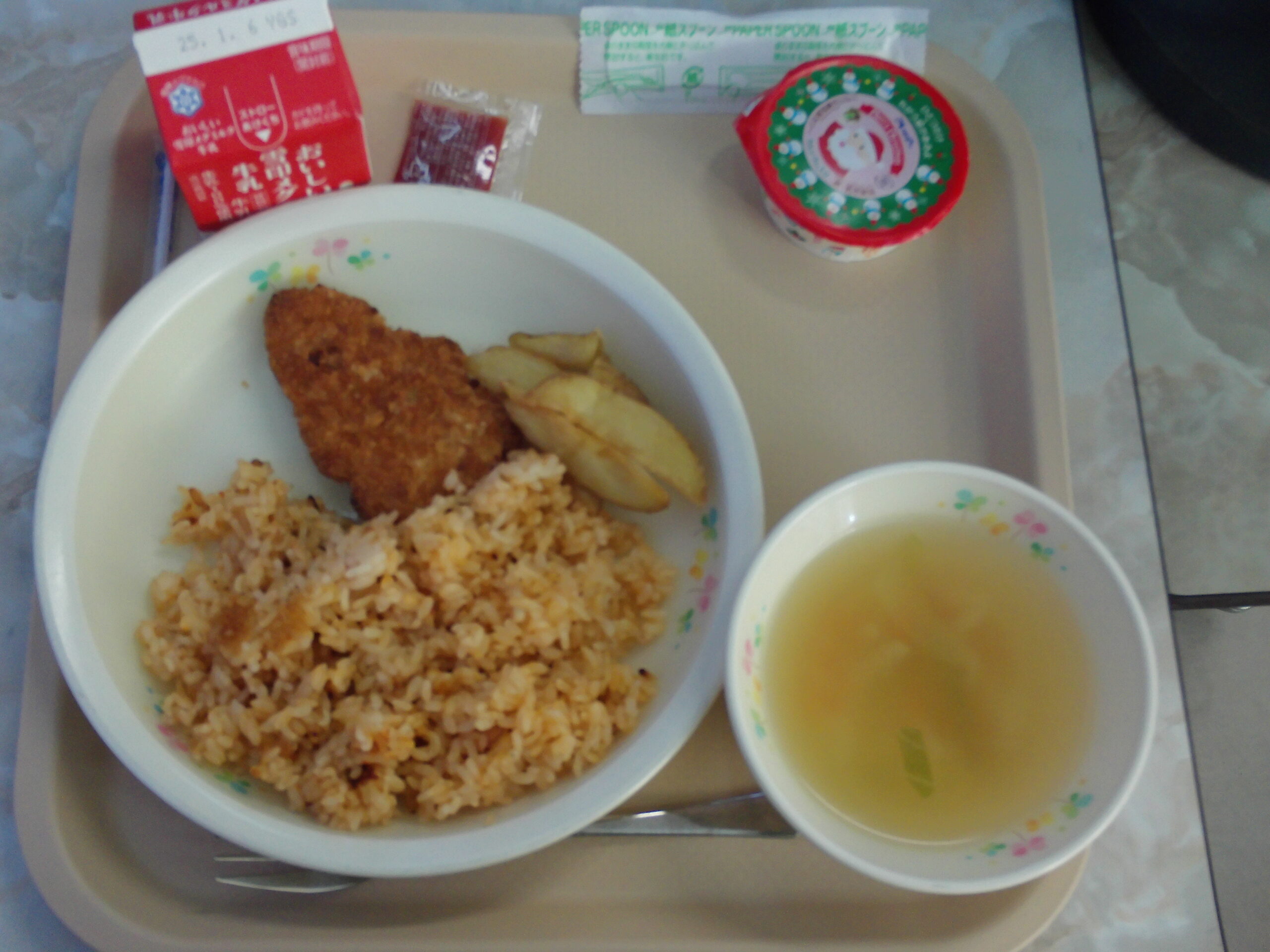 今日の給食献立は、クリスマス給食です。献立は、チキンライス、ポテト、もみの木チキン、小袋ケチャップ、ジュリアンスープ、クリスマスデザート、牛乳です。今日が二学期給食最終日です。大掃除で少し疲れた子どもたちも、楽しんで食べていました。
