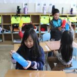 1年生のみんな、まずはペットボトルに水を汲んできて、大事そうに教室まで持ってきました。キャップの内側に豆粒ぐらいの絵の具をつけてもう一度しっかりふたをして…