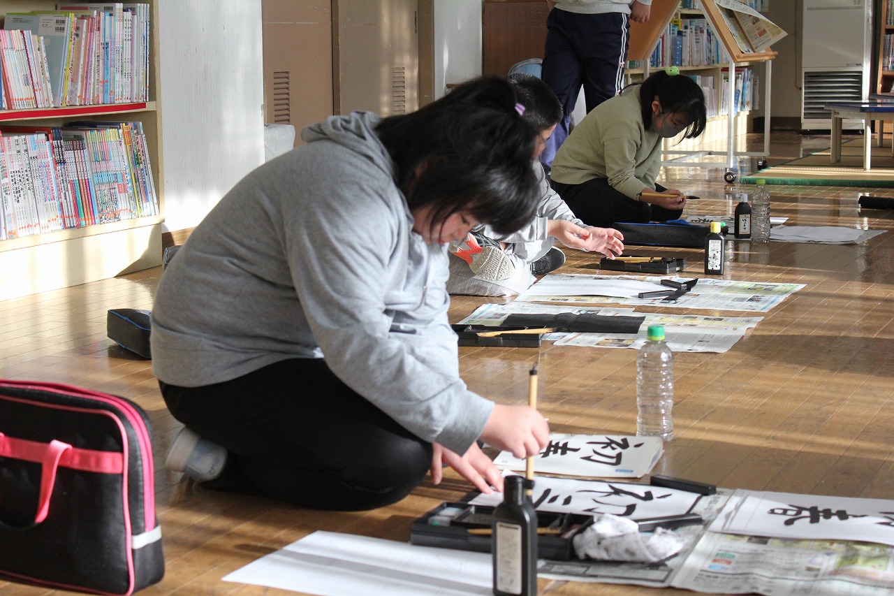 5年生が挑戦していた書き初めは、「世界の国」「初日の出」。とめやはね、はらいに気をつけながら、一画一画丁寧に筆でしたためている姿が印象的でした。