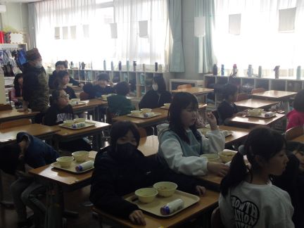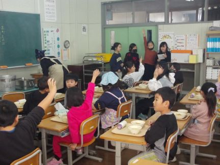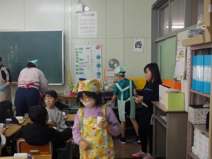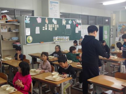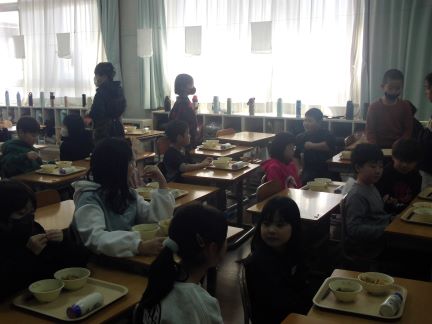 今日の給食は、きのこご飯、にんじんとほうれん草のみそ汁、ホロシリ牛乳です。今日は3年生のクラスの給食時間の様子です。給食当番がしっかりと分担して、スムーズに配膳を行っていました。いただきますの前に読む給食メモでは、今日のきのこご飯に関する3択のクイズでした。しめじ、まいたけ、干し椎茸の3種類のきのこが使われていることを紹介しました。