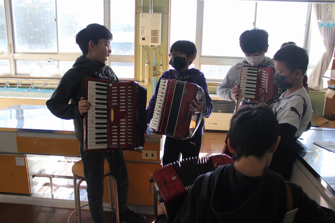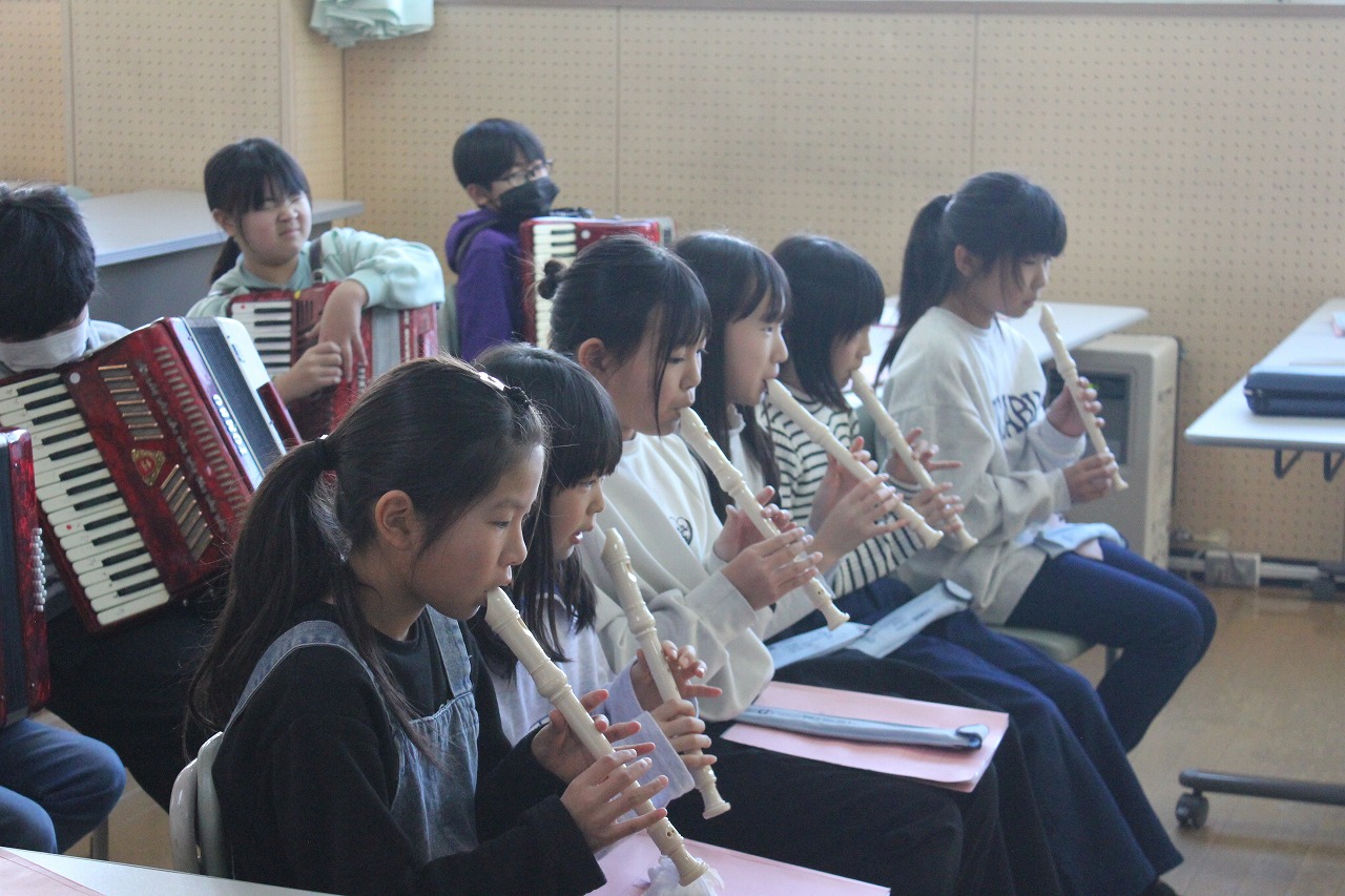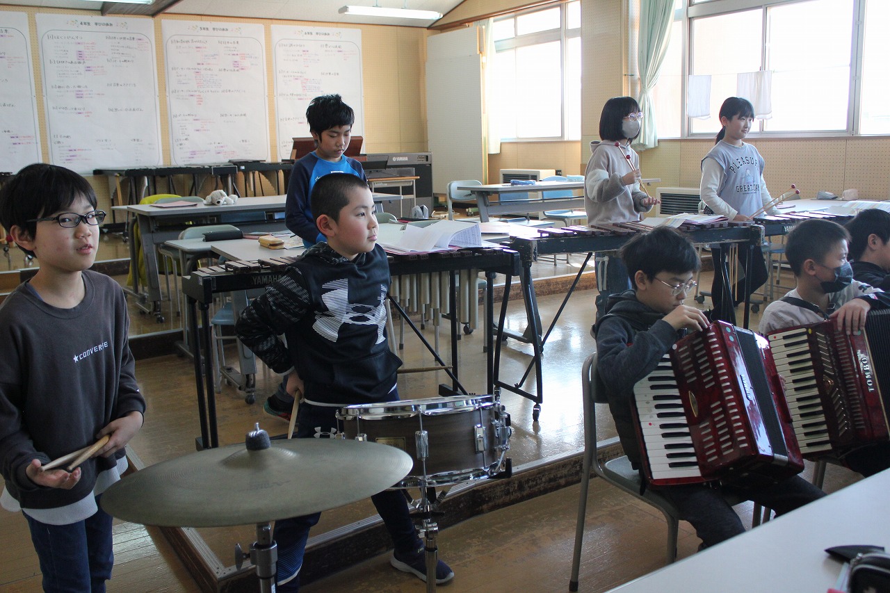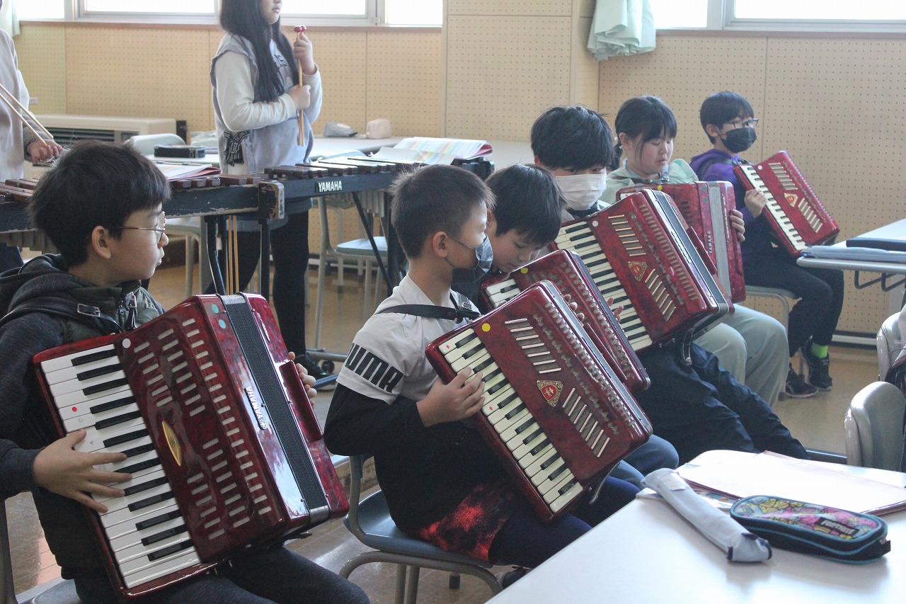 4年生は、このタンゴの名曲を「リコーダー」「アコーディオン」「木琴」「ピアノ」「バスキー」「小太鼓」「シンバル」のパートに分かれて練習し、音を合わせて演奏する楽しさを味わっています。