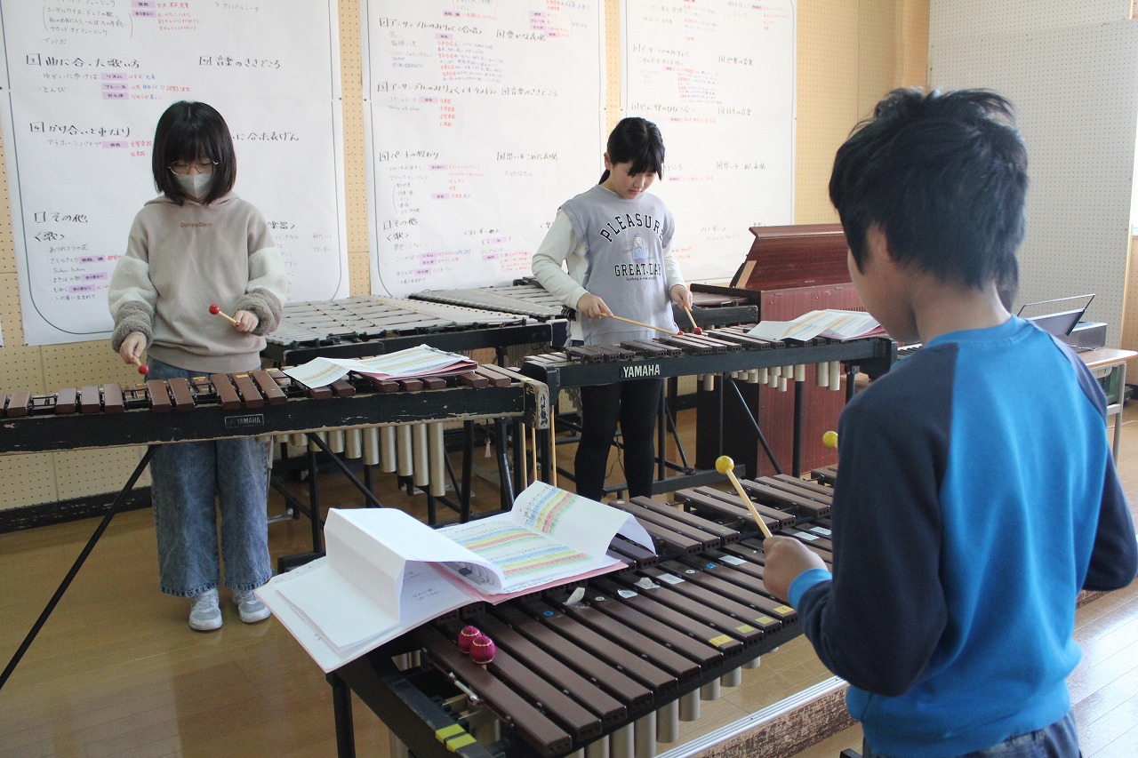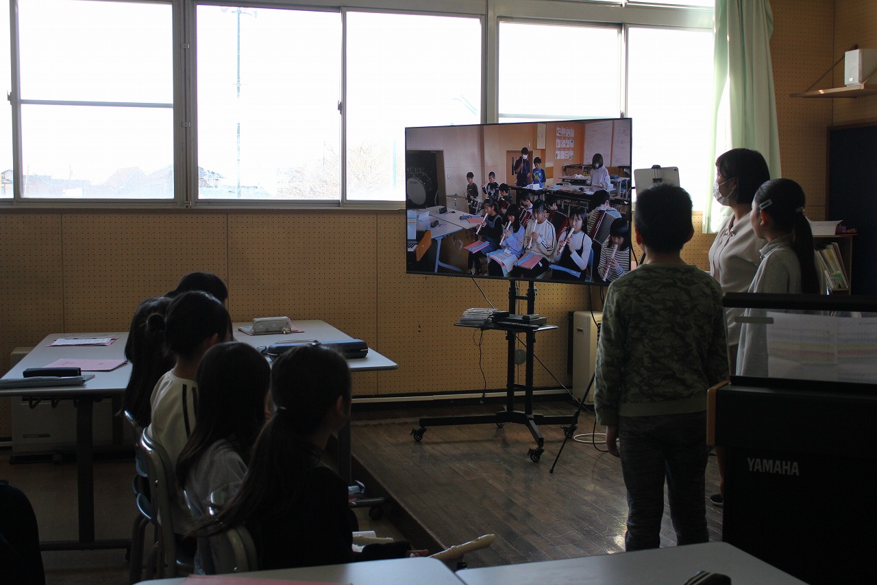 その後、動画で自分たちの演奏を振り返ったり、それぞれのパートがどんな音色でどのような旋律を奏でているのかを聴き合ったりしながら、パートの役割を確認していました。合奏には、ただ自分の楽器を自由に演奏するだけでなく、お互いの音色を聴き合って曲の特徴を捉えた表現を工夫するという楽しさがあります。