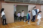一年生入場・・・入学式のときは緊張顔で6年生に手を引かれての入場でしたが、一年生を迎える会では少しリラックスした雰囲気の1年生のみんなでした。