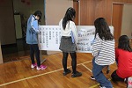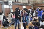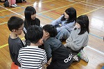一年生を迎える会では、2つのゲームを楽しみました。まずは、『数合わせゲーム』。書記局のお手本通り、たいこの音の数だけ人数を集めグループを作り、できたグループで自己紹介をしました。いろいろな学年のさまざまな人とグループを作り、新しい出会いを楽しむことができました。自己紹介をし合う場面では、自然と笑みがこぼれました。