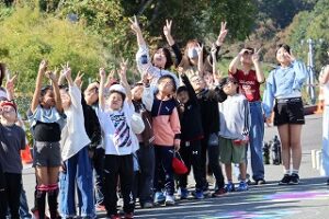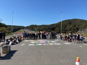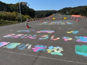 道路上にチョークで絵を描く体験では、思い思いの色を手にして友達と相談しながら塗りました。工事の最中ということもあり、たくさんの作業員さんの仕事を見ることで多くの学びがあったようです。