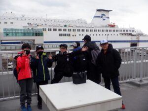 苫小牧港では港開設の歴史映像を見た後、外に出てフェリーや貨物船を見学。とてつもない大きさに圧倒されていました。