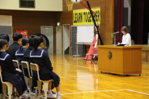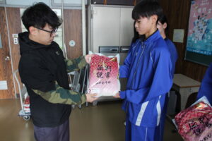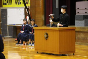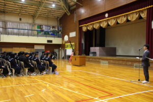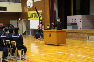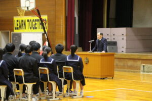 12月23日(火)2学期終業式が行われました。学習はもとより、1年生はふるさと学習発表会・2年生は職場訪問でのキャリア学習・3年生は学校祭等の行事での学校のリーダーシップ発揮など、さまざまな場面で生徒一人一人が自分の役割を意識し、仲間と協力しながら取り組む姿が見られました。困難なことにも粘り強く向き合い、心身ともに大きく成長した学期であったと感じています。