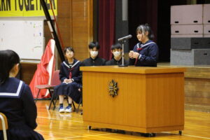 22日間の冬休みは、3年生は進路の自己実現に向けた重要な時期であることは言うまでもありませんが、全生徒とも、これまでの生活を振り返りながら、心と体をしっかりと整える大切な期間です。ご家庭や地域での時間を通して、充実した休みとなることを願っています。3学期も、生徒たちが安心して学び、成長できる学校づくりに努めてまいります。引き続き、ご支援・ご協力をよろしくお願いいたします。