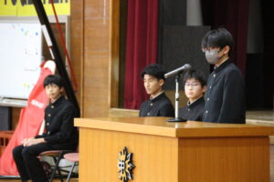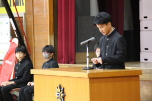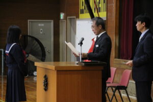 1月15日(水)3学期始業式が行われました。3学期の登校日数にして、46日間、3年生にいたっては40日間と短い学期ですが、それぞれの学年のまとめということで、重要な毎日となります。1年間の成長を振り返って、次へのステップとなるように努力していきましょう。同時に、第43回森みつ少年少女文芸賞の表彰式も行われました。本校からは3名の生徒が選ばれ、新冠町の教育長さんから直に表彰状が渡されて、全校生徒に祝福されていました。
