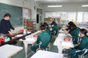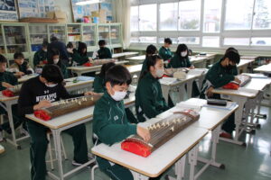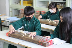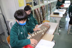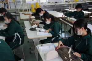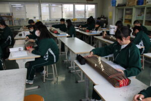 11月11日(火)、1年生の音楽の授業で、日本の伝統楽器に触れて、箏の音色の美しさまで感じられることを目的に、二人ペアでの授業を行いました。日本古来の楽器の良さを感じてるとともに、皆で合奏することの楽しさを味わうことで、音楽に親しみを感じてほしいものです。