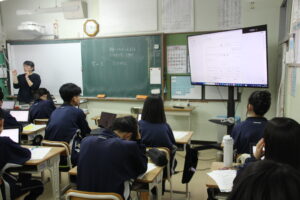 10月21日(火)日高管内の数学授業研究会が1年B組にて行われました。管内から40名近い教員やその関係者が来校し、先生方が数学の授業方法について、交流し学び合いました。生徒たちは、クラスの生徒の2倍くらいのお客さんに見守られたためか、いつもより緊張気味で授業の臨んでいました。先生方の感想からは、「新冠中の生徒は、とても落ち着いていて、男女分け隔てなく協働して学習できているし、とてもすばらしい」と賞賛の声が上がっていました。