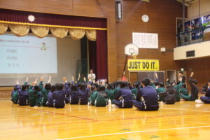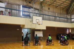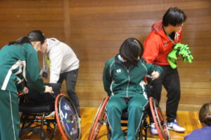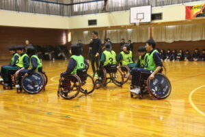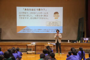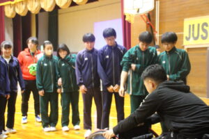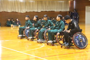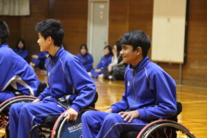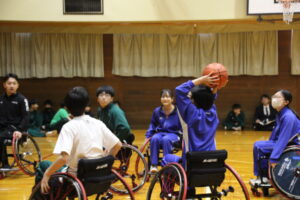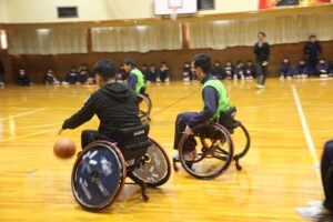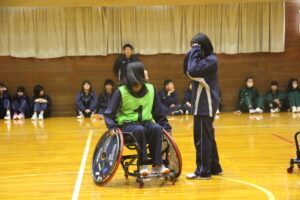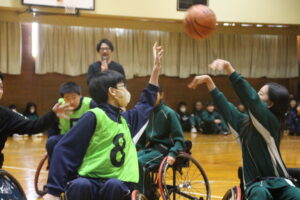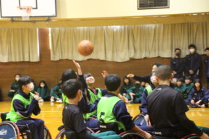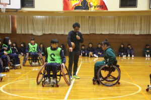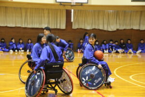 11月26日(水)学社融合社会教育の一つとして、パラスポーツ教室が行われました。元日本車いすソフトボール監督を講師としてお招きし、車いすバスケッとボールの体験をしました。テーマは、「共生」。みんながもっている背景が違えども、誰もが楽しめる環境を自分たちで作っていくことの大切さを教えていただきました。