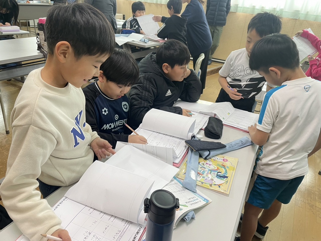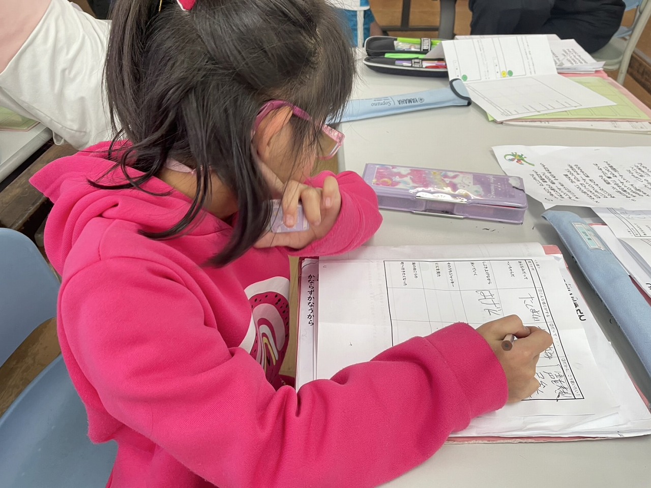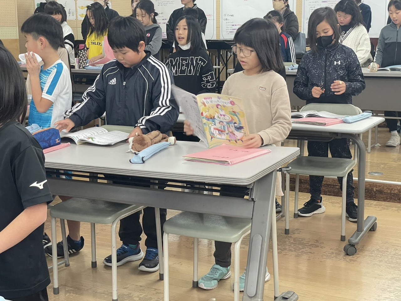 高学年は、早速休み明けの漢字のテストに取り組んだり、外国語でペアになって町にある物を英語で紹介し合ったりと、初日から集中して各教科の学習に取り組む姿が見られました。
