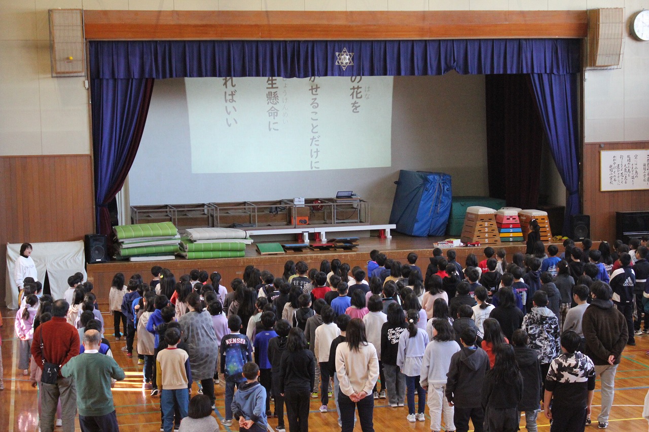 冬休みの思い出をいっぱい胸に詰め込んだ全校の子どもたちが体育館に集まり三学期の始業式を行った後に、「農水新冠賞」と「森みつ少年少女文芸賞」の表彰式が行われました。ご来校いただいた2名の教育委員の方々から賞状が手渡されました。