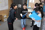 上の写真は、希望する場所ごとに分かれてチームをつくっているところです。自分たちで人数を数えながら、「だいたい10人ずつだから・・・」「校長室、5人だと少ないね」「図書室、いっぱいいる!」「図書室から校長室に移動したらいいんだ」・・・と気づき、考える2年生は、やる気満々。1年生をみんなで案内するんだ!という意欲が伝わってきました。改めて1つ上級生になったという成長を感じた場面でした。